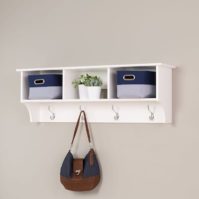 White entryway cubbie shelf keep your gloves, hats, coats and jackets together where you need them with the and perfect for any front hallway, mudroom or home office, it's three compartments have room for everything from mittens to schoolbooks. Prepac™ Entryway cubbie shelf in white finish helps keep your gloves, hats, coats and jackets organized. Shelf easily mounts to wall with its innovative hanging rail system providing a sleek and traditional look.