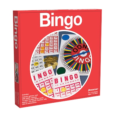 Will it be B7? G34? It's as easy as B-I-N-G-O! Use the spinner to find out which number and letter to call out next. Be quick and lay down your token to claim the number. Be the first player to B-I-N-G-O in any direction and yell it loud to win! Includes everything you need to get your game night started right! This classic game comes with a colorful spinner card! For 2-6 players, ages 7 and up. Each game includes 1 colorful spinner card with plastic spinner, 14 Easy-to-Read Bingo cards, 100 plastic markers, 1 Tally card, and complete instructions. For 2-6 players ages 7 and up.