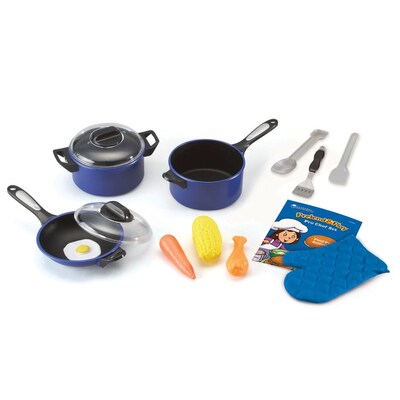 - Includes large deluxe stock pot, saucepan, 2 lids, skillet, spatula, 2 cooking spoons, oven mitt, play food (chicken leg, carrot, corncob and fried egg) and write and wipe activity guide