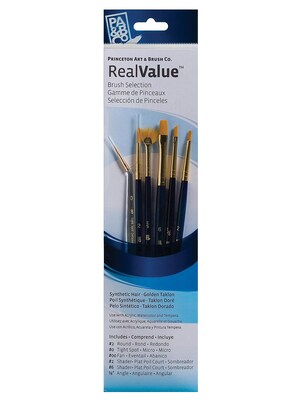 - 9139 Set contains five short handled, synthetic golden taklon brushes: three Rounds (sizes 2, 4, and 6) and two Angulars (1/4 in. and 1/2 in.)