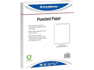 Keep laser, digital or inkjet printers and copiers stocked with this five-count ream of Printworks Professional multipurpose paper. The five-hole punched top is ideal for patient charts or filing invoices, and the perforations on this Printworks Professional copy paper let you file documents neatly and efficiently.