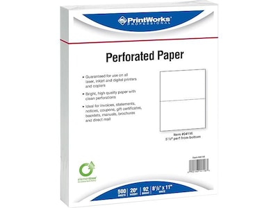 Stock office copy rooms with this letter-sized Paris Corporation Printworks Professional perforated paper, and easily handle large printing jobs. Ideal for nearly all businesses, this high-quality perforated paper is perfect for printing invoices, statements, reports, and a variety of other applications. This Printworks Professional perforated paper runs quickly through all copiers as well as inkjet, laser, and digital printers.