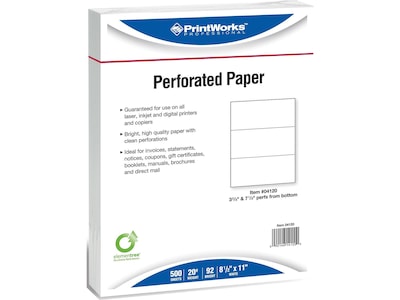 Get high-quality print results every time with this 20-pound paper. The sheets are perforated, making them easy to separate without creating jagged edges, while the 20-pound weight gives each one a sturdy feel. This Printworks Professional perforated paper comes in a carton of 2500 sheets, making it easy to stock up the office supply cabinet.