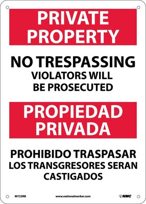 National Marker "Private Property No Trespassing Violators Will Be Prosecuted" bilingual safety sign measures 14" x 10" and is made rigid plastic material for added durability.