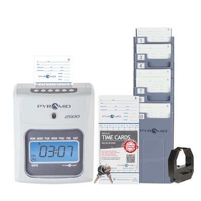 - Bundle includes 2500 Auto Aligning Time Clock, 100 Time Cards, Ink Ribbon Cartridge, 10-slot employee time card rack, 2 Security Keys, User Guide