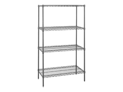 House products and supplies with this shelving starter kit. The all-welded construction features extra wire trussing so the unit can support loads up to 800 pounds, and the included foot levelers ensure stability. Air circulation and visibility is enhanced by the open wire design, and the chrome finish adds style and durability. This Quantum Storage Systems shelving starter kit boasts a convenient tool-free assembly.