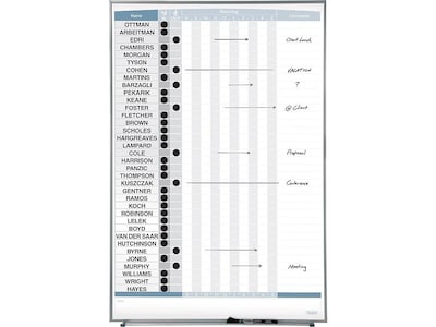 View employee itineraries at a glance by using this in/out magnetic tracking board. With a smooth dry-erase surface, this board makes it easy to update and edit, while the magnetic dots provide quick identification of who is in or out at the office. This Quartet Matrix employee tracking board can keep tabs on up to 36 members at once and can be mounted onto the wall, providing quick and easy viewing.