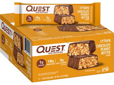 The Quest Chocolate Peanut Butter is a chocolate-coated hero protein bar packed with a crispy, chewy core filled with peanut butter and only 1g of sugar.