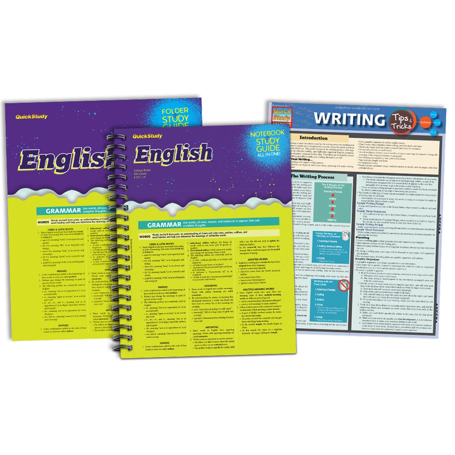 - Set Includes: 1 Notebook (100pg count) with a built in English study guide, 2 pocket folder with a built in English study guide and a 3-panel Writing Tips & Tricks laminated reference guide