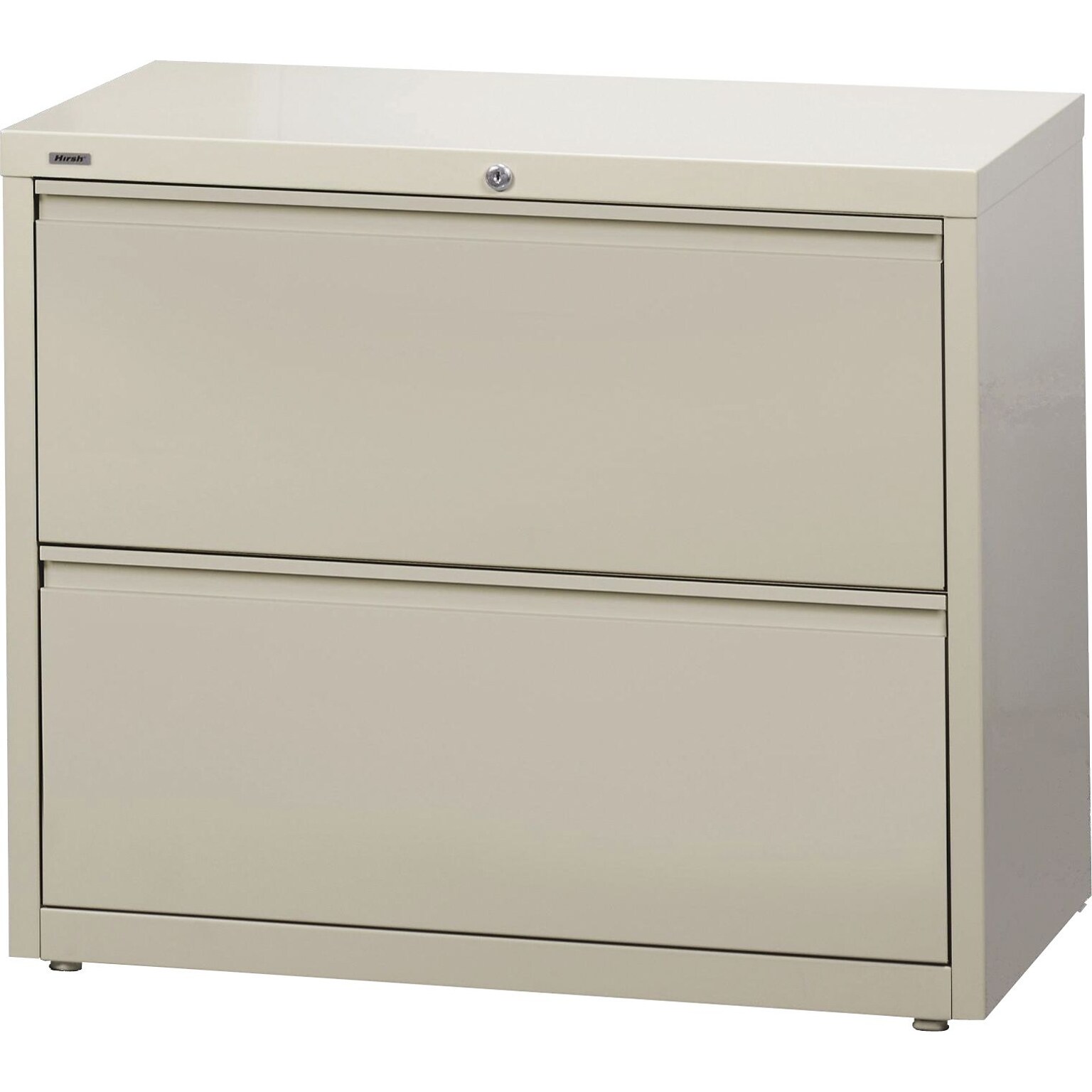Two-drawer lateral filing cabinet holds letter or legal size documents