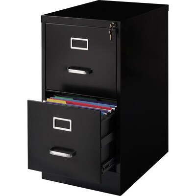 Add extra file storage to your office with this black two-drawer vertical file cabinet.