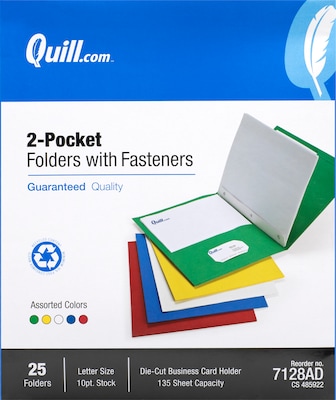 Quill Brand 2-pocket folders with fasteners help you store and present paperwork in style. Each folder offers ample, secure storage space for up to 100 sheets of paper, making it an ideal solution for a wide range of office uses. The assortment of colors in each pack offers a great opportunity to code folders for quick and easy identification.