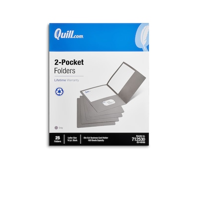 - Quill Brand® 2-pocket folders include a die-cut business card holder