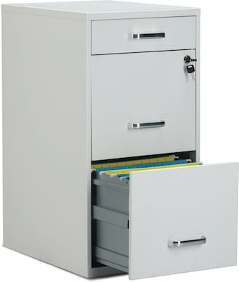 Get a space-efficient solution to recordkeeping and document storage with this three-drawer light duty vertical file cabinet. Ideal for organizing offices, the top drawer provides space for storing supplies, and the bottom two drawers accommodate a large number of letter-size files. The compact design lets this cabinet fit in small spaces, while the white finish and polished handles enhance office decor. This utility file cabinet keeps stored items secure with a built-in lock.