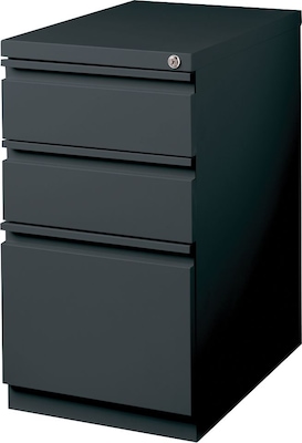 Maximize office space and keep important documents organized with this three-drawer mobile pedestal file cabinet. This compact cabinet fits easily in most offices and features concealed smooth-rolling casters for easy portability. Ideal for staying organized, the top two box drawers provide space for storing office supplies and personal items, while the letter-size bottom drawer offers ample space for storing documents and paperwork. This mobile pedestal file cabinet features a removable lock that lets you secure stored items while out of the office.