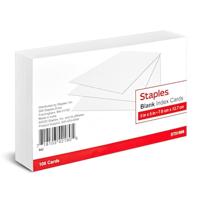 Staples 3" x 5" Index Cards, Blank, White, 100/Pack (TR51008)