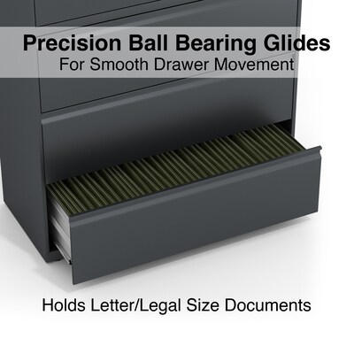 Improve office organization and easily locate important records with this black five-drawer letter/legal lateral file cabinet. Get a secure document storage solution and keep track of business records with this five-drawer lateral file cabinet. This 42-inch-wide cabinet takes up minimal floor space and offers impressive durability with its rugged design and scratch-resistant black baked-enamel finish. The five large-capacity drawers easily accommodate large numbers of legal, letter and A4-sized hanging folders and feature adjustable hang rails for side-to-side filing. This letter/legal file cabinet lets you secure stored documents with a built-in lock.