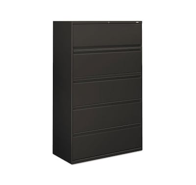 Get a secure document storage solution and keep track of business records with this five-drawer lateral file cabinet. This 42-inch-wide cabinet takes up minimal floor space and offers impressive durability with its rugged design and scratch-resistant black baked-enamel finish. The five large-capacity drawers easily accommodate large numbers of legal, letter and A4-sized hanging folders and feature adjustable hang rails for side-to-side filing. This letter/legal file cabinet lets you secure stored documents with a built-in lock.