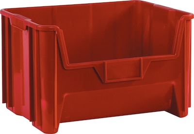 Quill Brand Giant stackable bin in red color measuring 19 7/8" x 15 1/4" x 12 7/16" is made from injection molded HDPE for added durability. Bin stack up to 6" bins for reliable storage of items and is suitable for recycling/storing tools.
