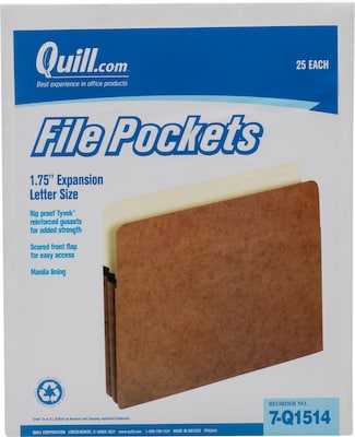 Quill Brand® Reinforced File Pocket, 1 3/4" Expansion, Letter Size, Brown, 25/Box (7Q1514)