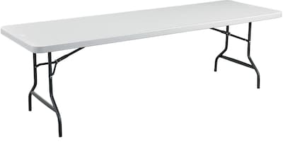 Expand your available work, dining or meeting accommodations with this folding table. The 8-foot length provides comfortable seating for up to eight people, and the durable polyethylene resin tabletop withstands scratches, scuffs and stains for enduring quality. Featuring a neutral color scheme, this table offers a professional look with or without a tablecloth. A sturdy metal frame with integrated supports provides added strength and stability. With its folding design, this 8-foot table is easy to store in between uses.