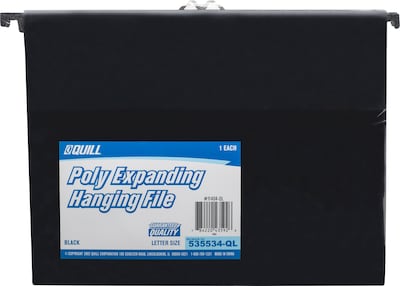 Keep documents and reports safe and secure in this Quill poly hanging expanding file. This sturdy plastic file folder fits easily into most standard filing cabinets for an easy-to-use hanging file configuration. The included tabs allow for versatile organization of the documents within, allowing everyone in the office to find what they need.