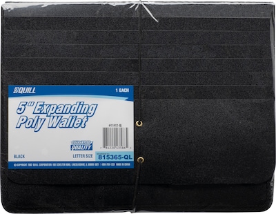 Store letter-size papers inside Quill Brand poly expanding wallets for easy filing of frequently used material or for storage in easily accessible locations. The black color blends seamlessly in any professional environment, and a convenient top tab lets you note what's inside without removing papers.