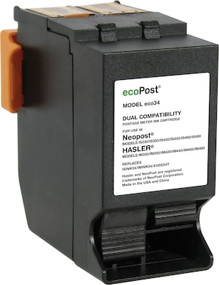 The Quill Brand remanufactured NeoPost/Hasler 34 postage red ink cartridge offers dual compatibility and great value when you need a reliable replacement red ink cartridge for your office postage meter. This unit is made from 70 percent post-consumer recycled content, so you help the environment with every mailing.