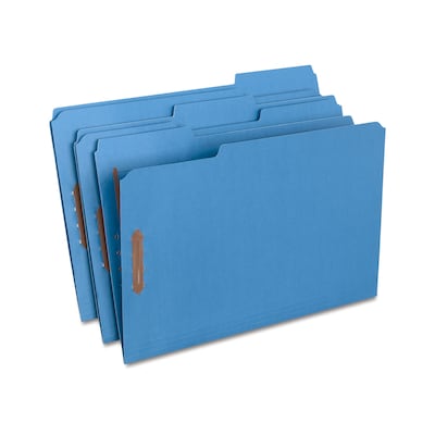 These blue folders from Quill are not just fun to look at; they are also strong enough to keep your company's files safe and sound. The tab edge of each folder is reinforced for extra strength, making it able to withstand constant searches through the file cabinet. Two fasteners work to bind the folder together.