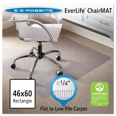 Extend the life of your flat to low pile carpet (up to 1/4" thick including padding depth) by protecting against chair caster wear and tear. The perfect addition to your workspace, this chair mat provides a smooth surface that enhances ergonomic comfort by allowing your rolling office chair to move freely. Easy to handle, this chair mat features rounded AnchorBar cleats (studs) that hold your mat in place and are gentle on carpets and fingers (no sharp spikes). This chair mat is made with durable vinyl that is GREENGUARD Gold Certified for low chemical emissions to promote a healthier workspace. Designed for use on carpeted surfaces only, do not use on hard floors.