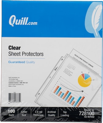 Slip important documents into Quill Brand top-loading sheet protectors to keep them looking great. At 2.8 mils thick, these clear covers withstand daily use.
