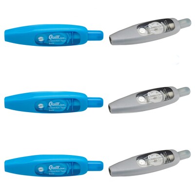 Mistakes happen, but getting rid of noticeable errors on otherwise flawless documents is nearly impossible, unless you supply your office with Quill Brand white-out correction tape pens. Quill provides an ample amount of correction tape inside of our easy-to-use pens, and you receive one grey pen and one blue penper package.