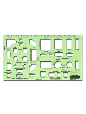 A variety of inking and drafting plastic templates made for the needs of architects and interior designers. Brands include Berol Rapidesign, Pro Art, and Pickett. Unless otherwise specified, scale is 1/4 in. = 1 foot.