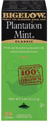 Bigelow® Plantation Mint Black Tea is a fresh and flavorful black tea blended with 100% American grown spearmint for a crisp, refreshing, minty cup of tea sure to delight your taste buds.