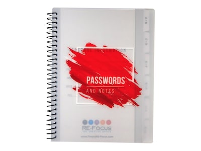 Make life easier with the mini password book by RE-FOCUS THE CREATIVE OFFICE. This smaller but just as functional version of the large password book keeps all your password information together in one convenient location. Alphabetical tabs organize your account information, such as website, username, password and more, including space for security questions. The premium paper stock holds up to erasers, and the sturdy cover resists bending, tearing, or scratching. It's the perfect size to slide into your backpack, purse, or briefcase if you're traveling for work or pleasure. Never forget your passwords again.