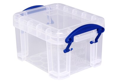 The Really Useful Box® with 0.14 liter capacity in transparent assorted colors can be recycled. Made with 100 percent polypropylene, these boxes are constructed for durability and have reinforced sides to increase compression strength so boxes maintain their shape. Totally flat bottom increases rigidity for stability and allows for perfect stacking with or without lid. The lockable lid is secured with two latchable handles to protect contents of the box from dust and water splashes. It measures 1-1/2" x 1-3/4" x 2-1/4" and is ideal for paperclips, nails, small home and office items