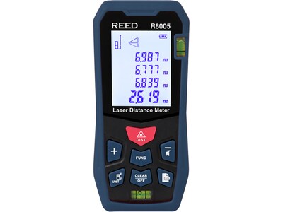 The Reed Instruments laser distance meter measures up to 164' and features a backlit multi-line LCD display and the ability to calculate area, volume, and sum of lengths. The meter is capable of retaining maximum and minimum readings and up to 99 measurements in memory.