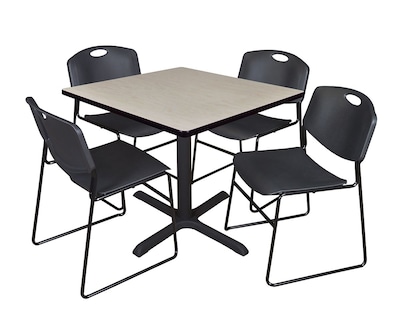 The Regency maple 36-inch square laminate table comes with four stacking black chairs. The chairs have hidden adjustable glides to prevent scratching the floor. Use the table and chairs in a lunch room, training room, restaurant or small conference room.