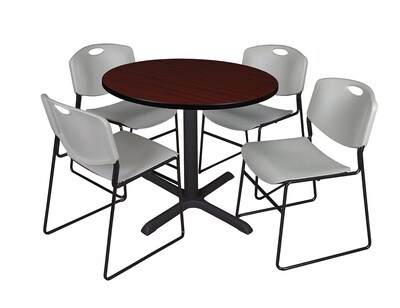 Regency 42-inch mahogany round table is made of thermal fused melamine with a laminate finish to protect against stains. It features an X-base for better stability and includes four Zeng stack gray chairs.