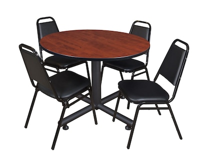 Regency Training & Hospitality round cherry laminate table has a thermally fused melamine laminate top that is resistant to stains. It features a black tubular steel post and includes four stacker chairs with black vinyl and padded for comfort.