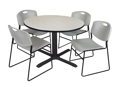 The Regency maple round table is made of thermal fused melamine with a laminate finish to protect against stains. It features an X-base for better stability and includes four Zeng gray stack chairs.
