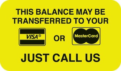 Hard-hitting message gets results from problem accounts and helps reduce staff time spent on collections 500 Fluorescent Chartreuse "Visa/Mastercard Balance Transfer" labels per roll