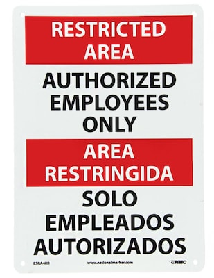 The Restricted Area, Authorized Employees Only Bilingual, 14X10, Rigid Plastic by National Marker is the perfect solution for all of your Caution & Hazard Signs Needs.