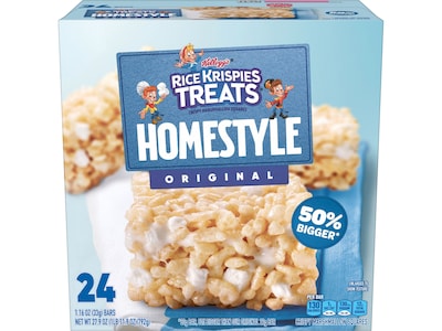 Snap, crackle, and pop invite you to discover a new take on a classic with Kellogg's Rice Krispies Treats Homestyle Original crispy marshmallow square. They have taken puffed rice cereal and folded extra marshmallows into this thickest, gooiest homestyle recipe. The individually wrapped marshmallow bar is perfect for snacks at school, the office, car rides, lunchtime, TV time, and more. Take this deliciously convenient, ready-to-eat treat wherever you and your family travel. Unwrap the simple goodness of Kellogg's Rice Krispies Treats Homestyle Original and feed your sweet cravings day or night.