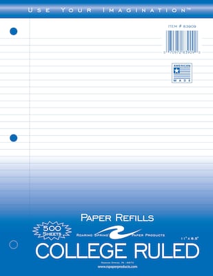 Roaring Spring Paper Products loose leaf filler paper is made with smooth 15 lb. white writing paper. Each pack contains 500 college ruled sheets with a red margin line. The paper is 11" x 8.5" and 3-hole punched. Poly wrapped with a printed top sheet. Proudly made in the USA!