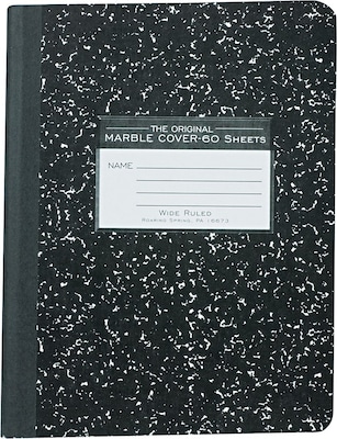 Record your notes in this permanently bound composition book. Paper is smooth 15 lb. writing paper with wide ruled blue lines and a red margin line. Covers are a hard white board that are printed in the traditional black marble pattern. Inside of covers is printed with class schedule and other useful information. Each book is produced with center-sewn and tape bound construction, not designed for sheet tear-out. Sheet size is 9.75" x 7.5" and there are 60 sheets per book.