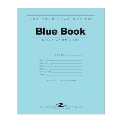 Roaring Spring Paper Products blue exam book has smooth 15 lb. white paper. Each book is 7"x 8.5" and contains 4 sheets/8pages of writing paper.Wide ruled blue horizontal lines with a red margin. Covers are 50 lb. offset. 2 staples along the 8.5" spine hold the book together. Made in the USA!