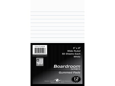 Take notes in the office or at home with the Roaring Spring Paper Products Boardroom Series 5" x 8" pad. The smaller size is great for countertops or for making shopping lists. The sheets are wide-ruled for easy note-taking. Each pad has 50 sheets of smooth 15 lbs. paper. The paper comes in white and is glued at the top for easy removal. The pad is supported with a stiff chipboard back cover. Made in the USA