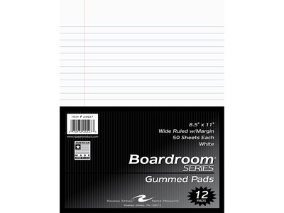 Take notes in the office or at home with the Roaring Spring Paper Products Boardroom Series 8.5" x 11" pad. The sheets are wide-ruled with a red margin line for easy note-taking. Each pad has 50 sheets of smooth 15 lbs. paper. The paper comes in white and is glued at the top for easy removal. The pad is supported with a stiff chipboard back cover. Made in the USA.