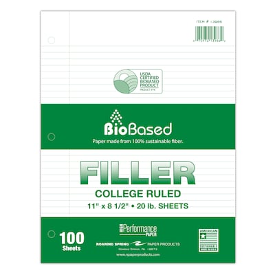 This Roaring Spring Paper Products BioBased filler paper is produced 20 lb. heavyweight paper and contains 30% post consumer waste. It is a USDA certified biopreferred product. Sold in packs of 100 sheets.